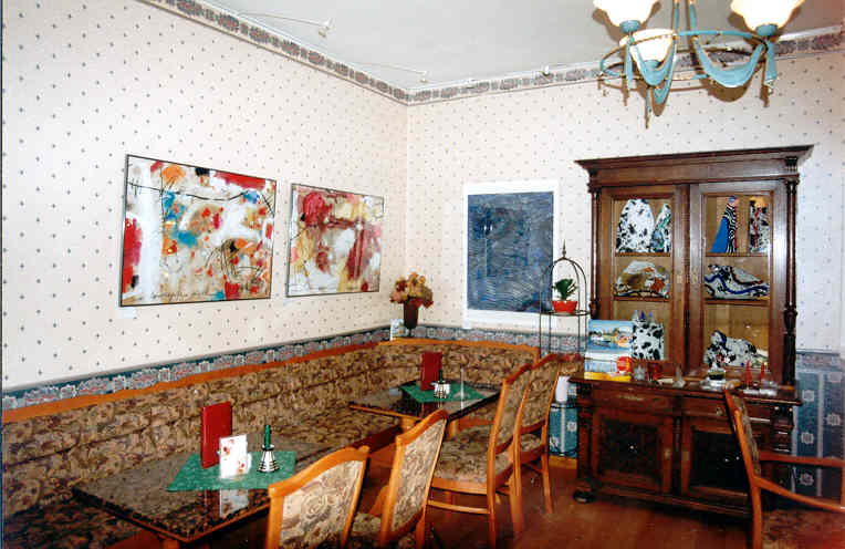 AKTUELLE AUSSTELLUNG : P. M. Heise; Malerei und Tonobjekte, Keramik A. Mühländer; " Tierporträts " Malerei der "Künstlerkolonie Torwachhaus" Unsere Galerie im Kaffee bietet die Möglichkeit Einzelausstellungen von Künstlern zu präsentieren. Im Abstand von ca. einem halben Jahr finden Ausstellungswechsel statt. Interessenten können sich jeder Zeit bei uns melden. Natürlich ist es möglich die ausgestellten Kunstgegenstände und Kunstwerke, sowie Handwerksobjekte käuflich zu erwerben. |